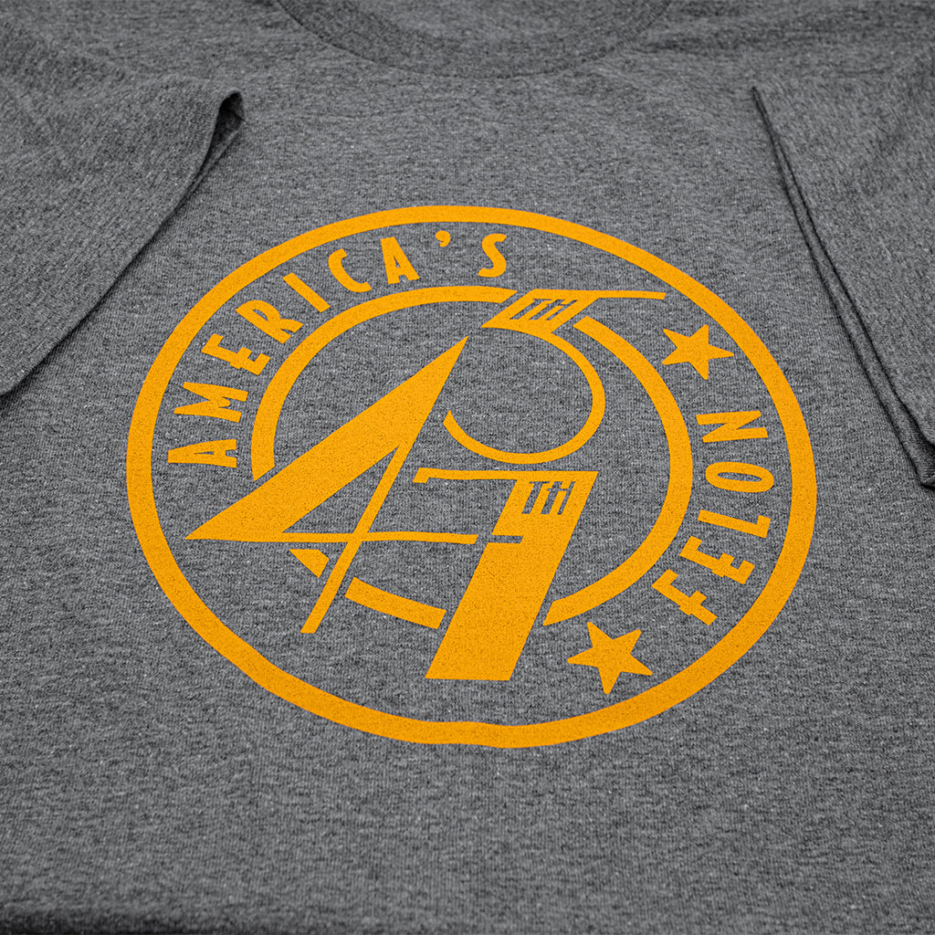 Stay stylish with the 45/47 America's Felon T-Shirt in a washed Gray. Featuring a simple, yet eye-catching, 1920's art-deco inspired typographical design in vibrant orange, this shirt is made from pre-shrunk 100% cotton for a comfortable fit. Show off your love for vintage flair with this unique and high-quality t-shirt.