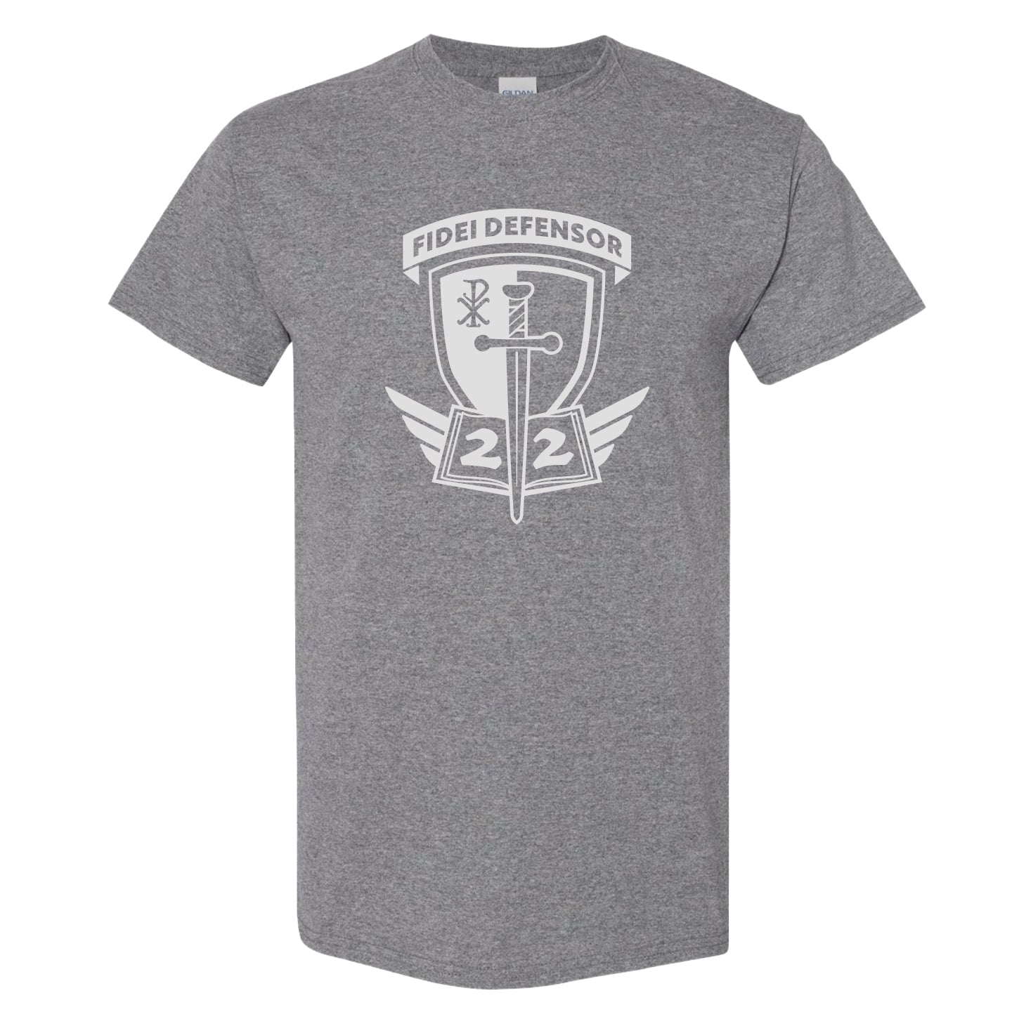 Fidei Defensor—Defender of Faith! This fun design combines a shield, sword, wings, and THE Book into one awesome illustration silk screened to the front of this soft, sturdy Shirt.