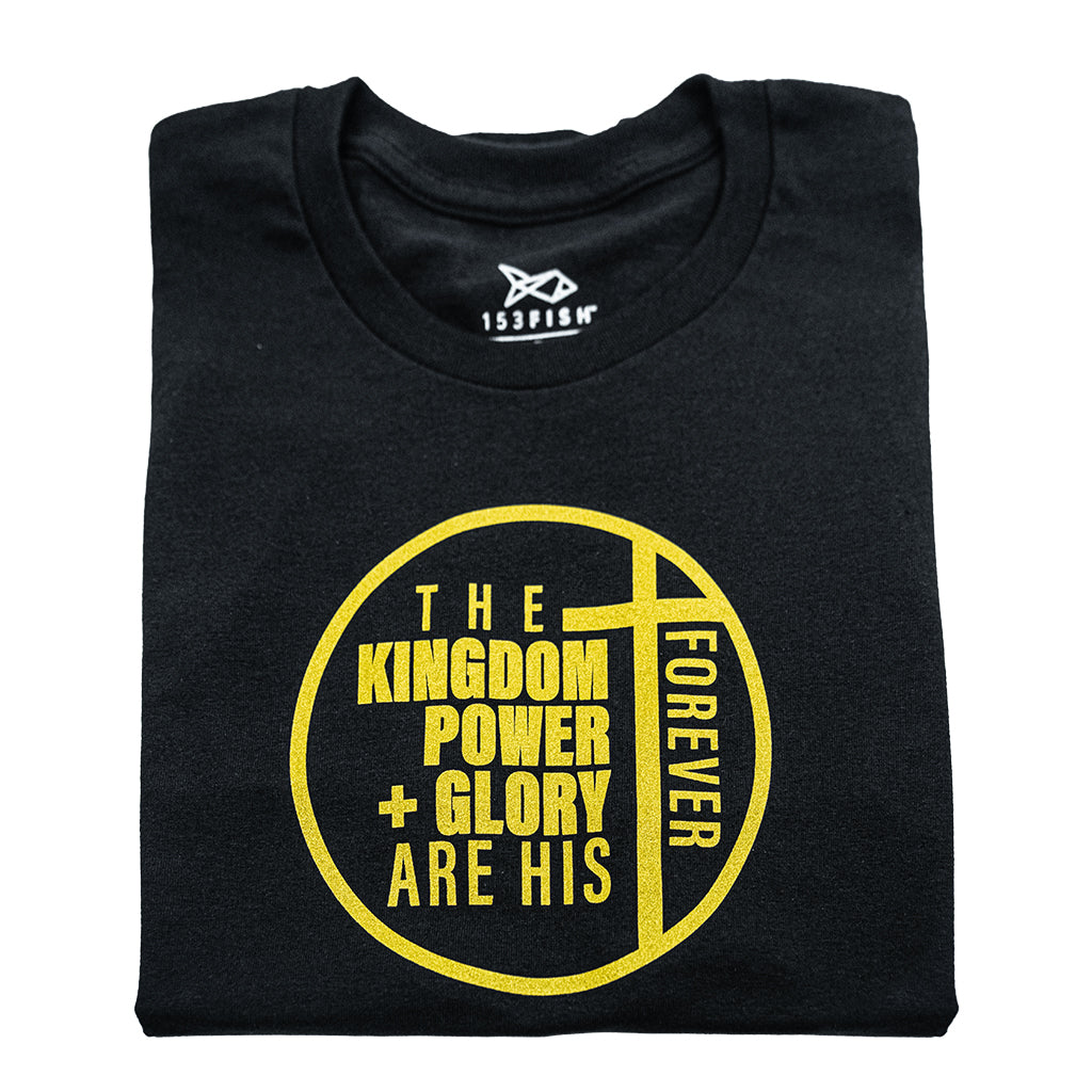 The Kingdom Power and Glory all belong to Him. This bold statement in gold, metallic ink, sits in clear contrast to a black 50/50 cotton poly blend shirt that's soft to the touch.