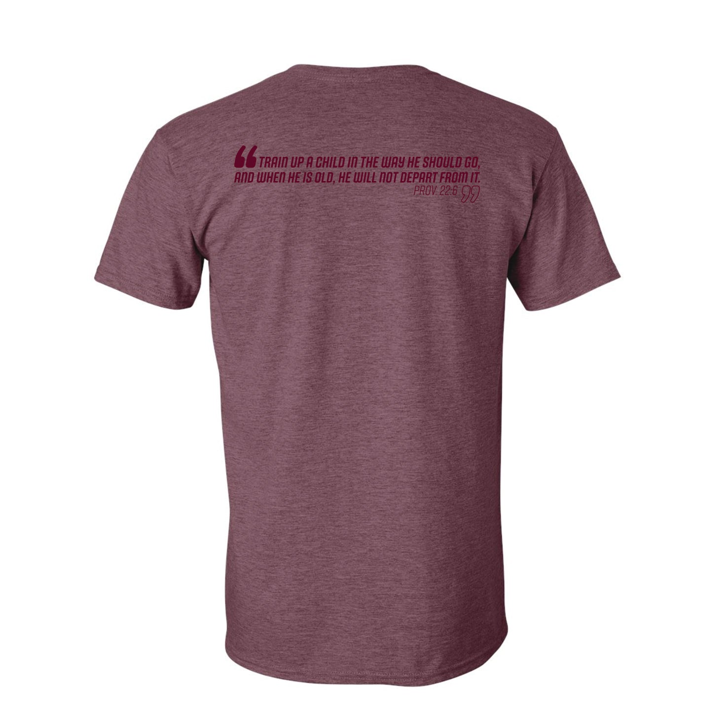 The marooned full Knights logo takes center stage on a cozy soft washed maroon cotton tee that's perfect for everyday wear. For added visual from behind, a stylized Proverbs 22:6 is silk screened in maroon ink on the upper back.