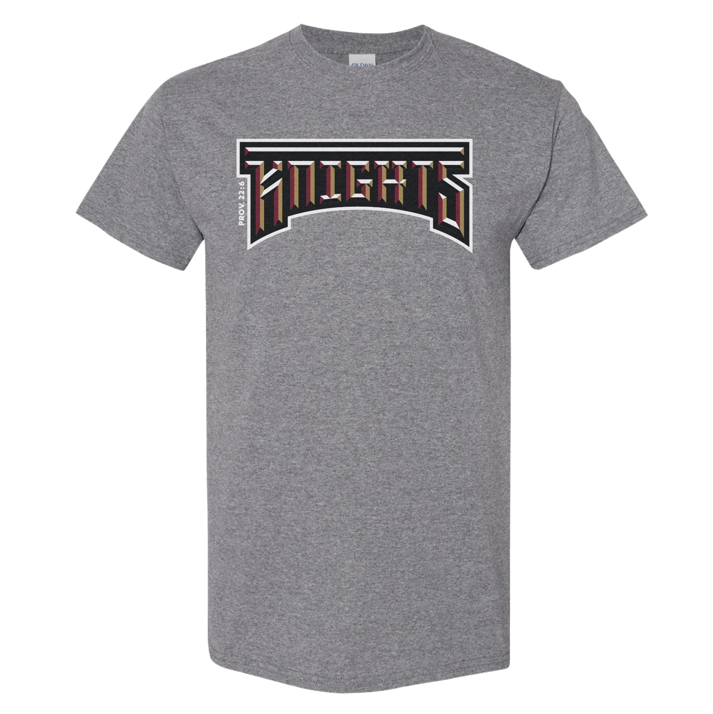 This playful design features the text PROV. 22 KNIGHTS, creatively using color and lines to give the P22 brand a fun 3D effect. Bright and bold, it takes center stage on a cozy gray cotton tee that's perfect for everyday wear.