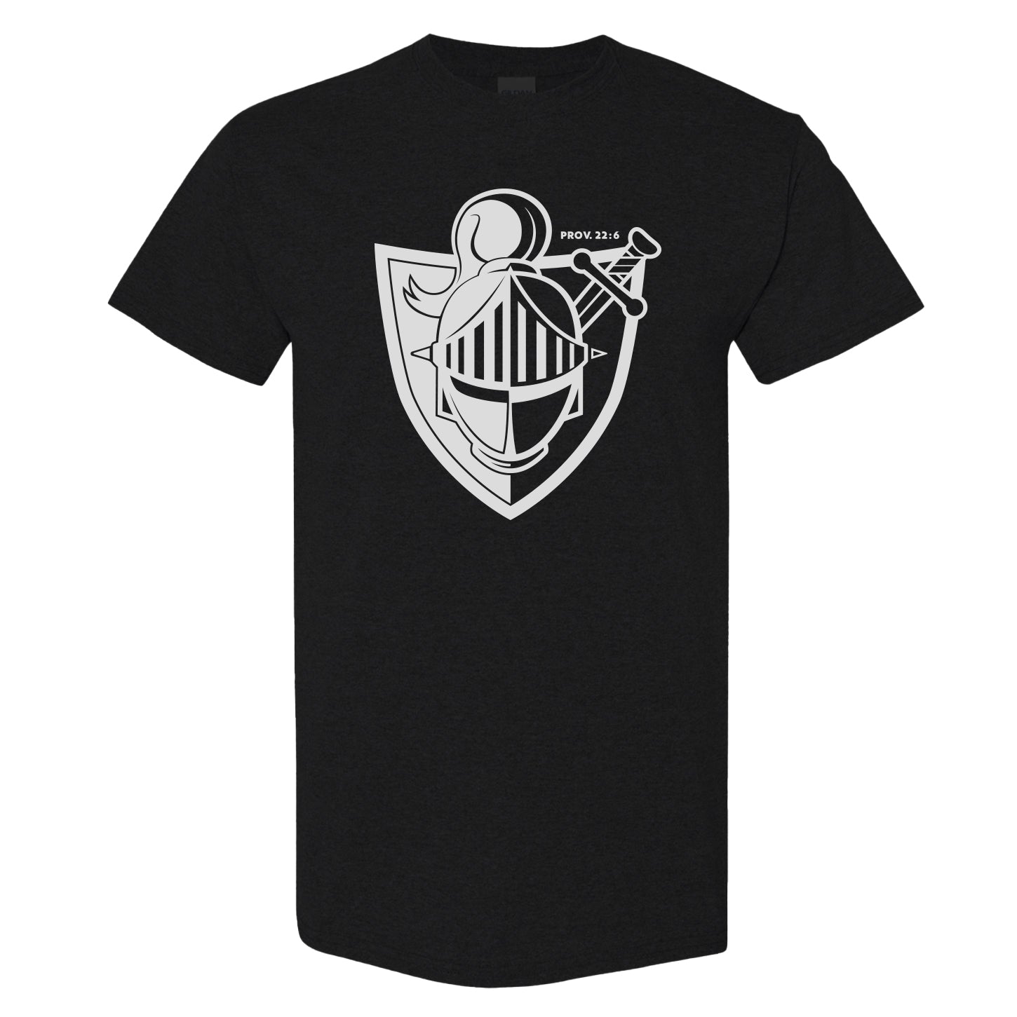 Check out our new design for 2025! P22 finally have a mascot. Represent the Knights, P22—defend all that is good, according to your ability. The motto, Proverbs 22:6 verse is silk screened on the back while the hero Knight is on the front of this soft, black shirt.